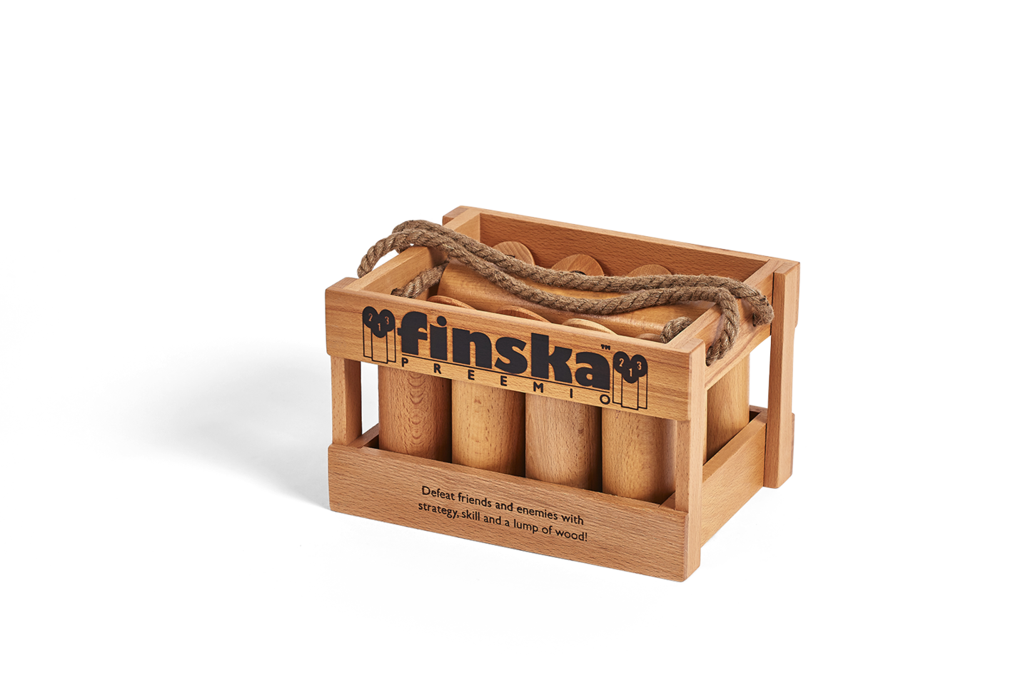 - Finska Preemio comes with varnished hardwood carry crate, numbered pins, throwing log as well as laminated rules and scorecard.